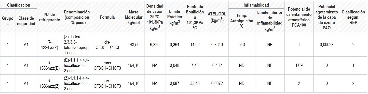 La entidad GAS N2ITROGEN, SL (B65101693) ha solicitado la ampliación de la relación de refrigerantes autorizados por el Reglamento de seguridad de instalaciones frigoríficas, con la inclusión de los refrigerantes con denominación simbólica alfanumérica R1224yd(Z), R1336mzz(E) y R1336mzz(Z). Entre la documentación aportada en la solicitud y en respuesta a un requerimiento de información adicional, se ha aportado la acreditación de las características del producto mediante las tablas de propiedades termodinámicas, químicas y físicas y las fichas de datos de seguridad de los refrigerantes. De acuerdo con la información aportada, dichos productos pertenecen al grupo de máxima seguridad (L1) según el Reglamento de seguridad para instalaciones frigoríficas.