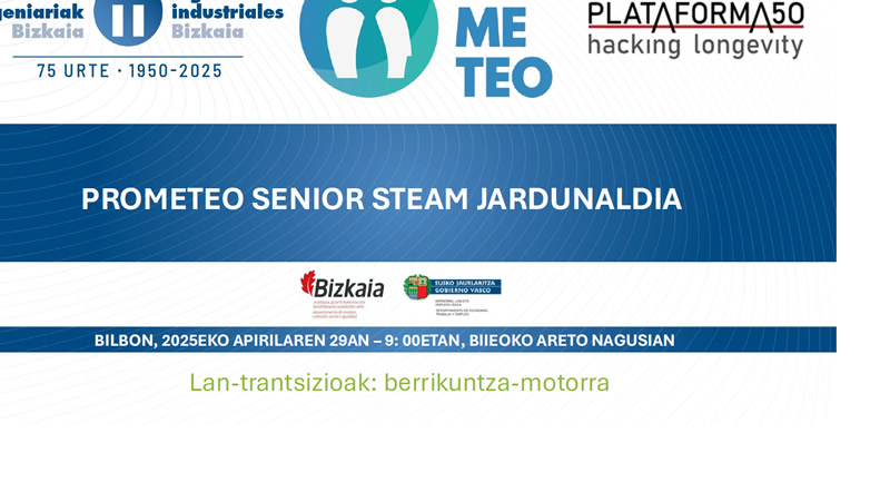 Bizkaiko Industria Ingeniaritzako Elkargotik (BIIEO) "Prometeo Senior STEAM" proiektua garatzen ari gara, 50 -Hacking Longevity plataformarekin batera trantsizio profesionaletarako, lanari eta adinari buruzko azterlan bat eginez.