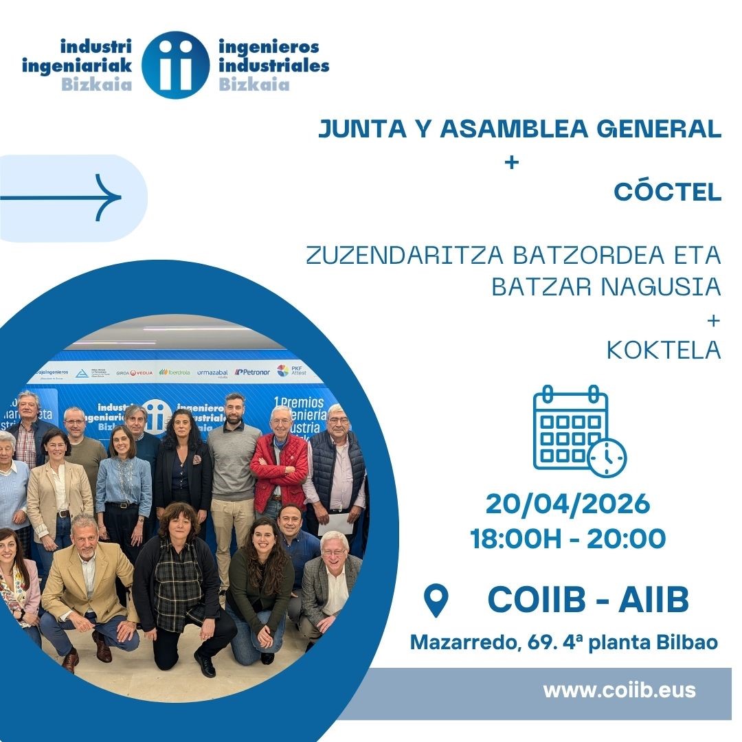Se convoca Junta General del Colegio Oficial de Ingenieros Industriales de Bizkaia (COIIB) y Asamblea General de la Asociación de Ingenieros Industriales de Bizkaia (AIIB), que se celebrarán simultáneamente el lunes 20 de abril de 2026, en el Salón de Actos de Mazarredo, 69 - 4ª planta, a las 18:00 horas en primera convocatoria y a las 18:30 horas en segunda convocatoria.