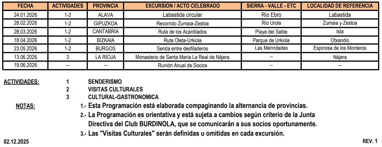 El Grupo Burdinola nos trae la programación de excursiones previstas para el Primer Semestre de 2026, para que podáis planificaros de antemano y apuntároslas en vuestras agendas.