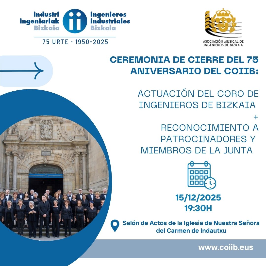 El 15 de diciembre, a las 19:30h, en el Salón de Actos de la Iglesia de Nuestra Señora del Carmen de Indautxu, tendrá lugar una actuación del Coro de Ingenieros de Bizkaia, en el marco de una ceremonia en la que se entregará una distinción a: